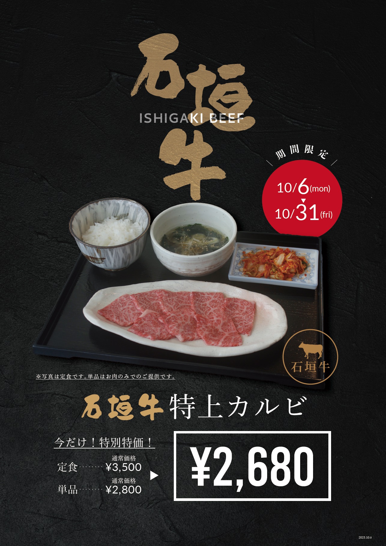 今だけ!特別特価! 石垣牛特上カルビ 定食 2,680円 単品 2,680円 期間:2025年10月6日~10月31日
