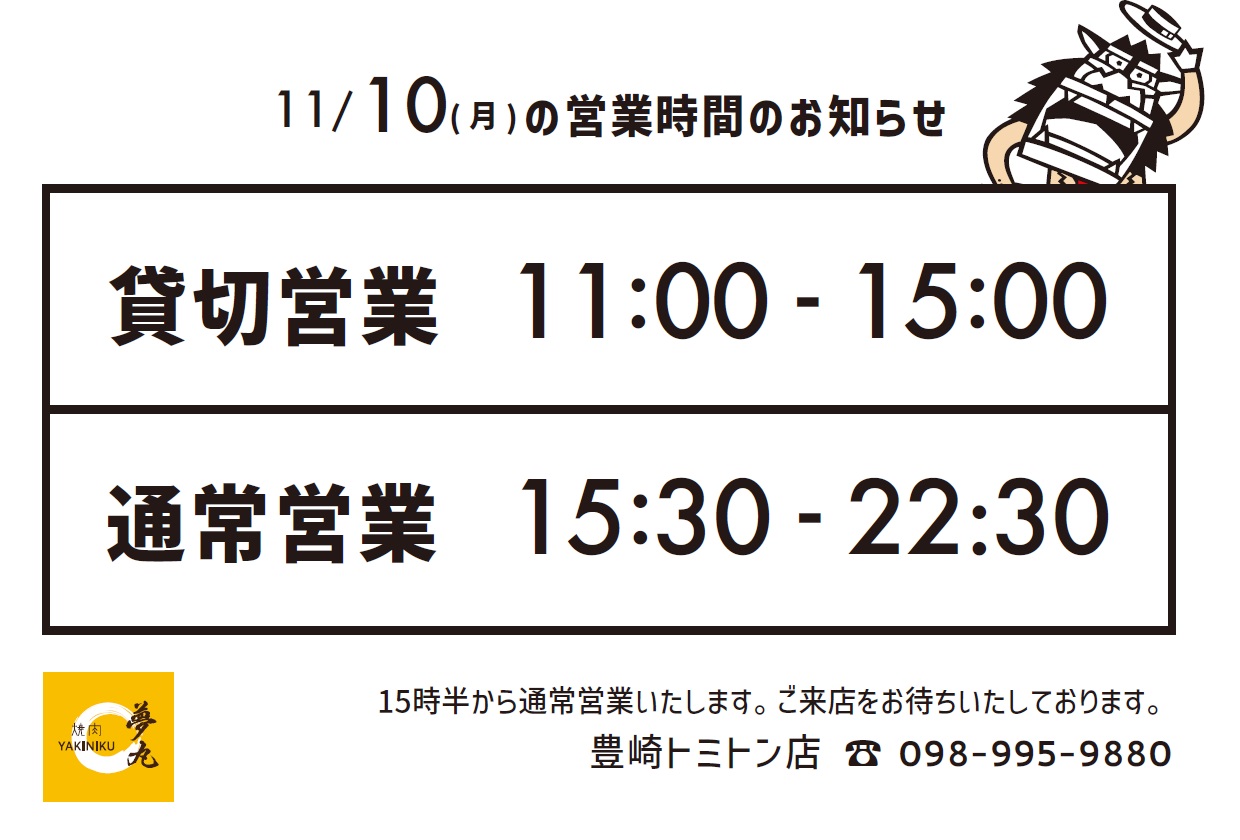 View Larger Image 豊崎トミトン店 営業時間変更のお知らせ 焼肉夢丸豊崎トミトン店 11/10(月)は貸切営業のため、通常営業は15時30分からとなります。 By 焼肉夢丸| 2025-10-24T17:51:17+09:00 2025年10月24日|Categories: お知らせ , 夢丸豊崎トミトン店|豊崎トミトン店 営業時間変更のお知らせ はコメントを受け付けていません コンテンツをシェアする FacebookTwitterGoogle+ 関連投稿 石垣牛特上カルビ【期間限定価格】 2025年10月03日 NAHAマラソン完走ランナーに1杯プレゼント 2025年10月03日 厚切り上牛タン 2025年9月01日 楽しいお食事がお客様の笑顔になる 2025年4月15日 おきなわマラソン完走ランナーに1杯プレゼント(2025/2/16限定) 2025年1月21日
